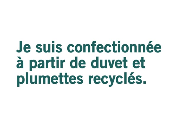 Mon garnissage est en duvet et plumettes recyclés de canard et oie.